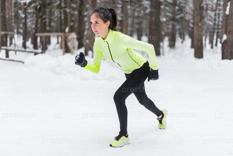 Девушка выполняет спортивные упражнения в зимнем парке