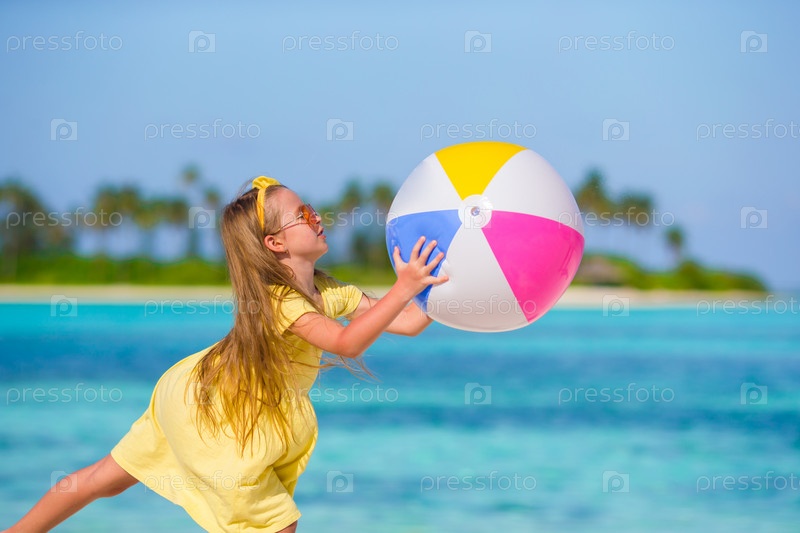 Маленькая девочка играет с мячом на пляже