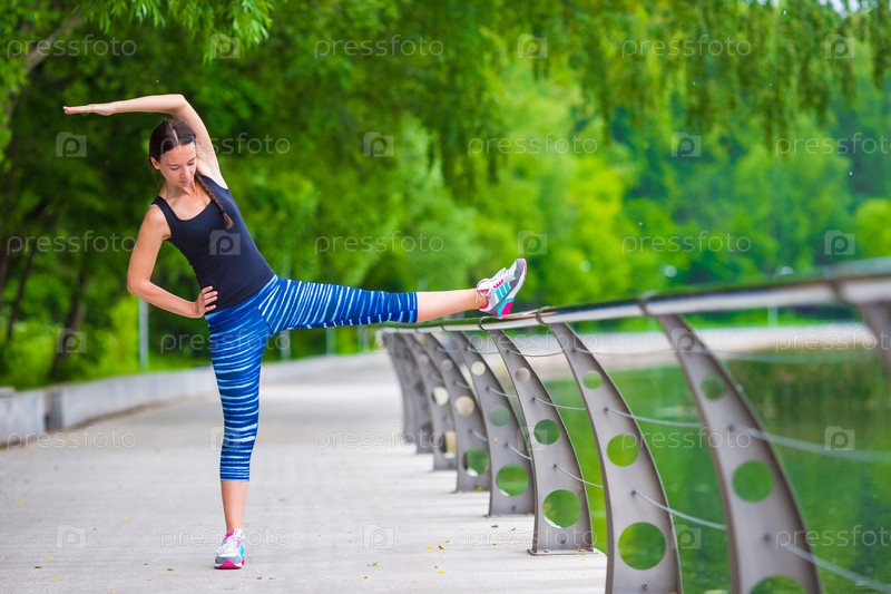 Девушка занимается растяжкой на свежем воздухе