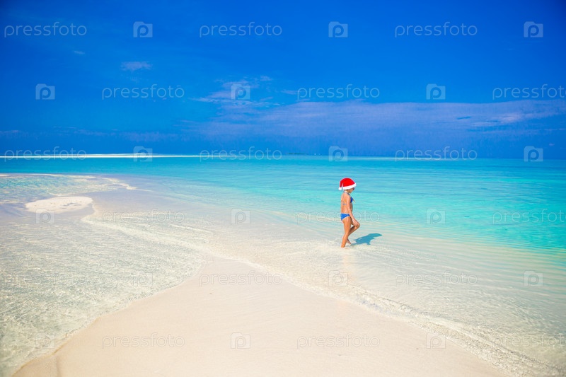 Маленькая девочка в рождественской шапке на пляже