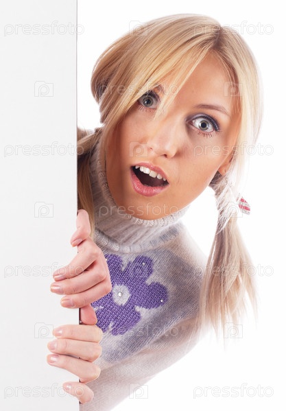 Удивленная молодая девушка на белом фоне