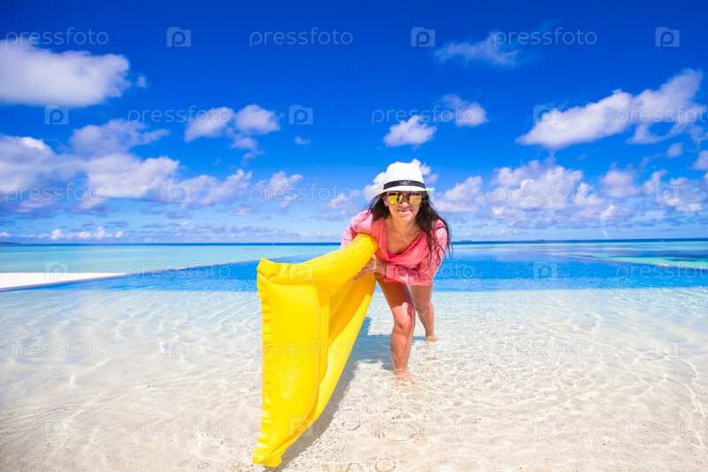 Молодая женщина с надувным матрасом на пляже