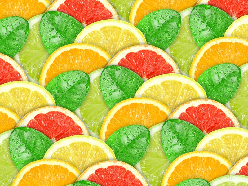 Дольки апельсина, лимона и зеленые листья, фон