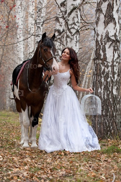Красивая девушка позирует с лошадью в березовой роще