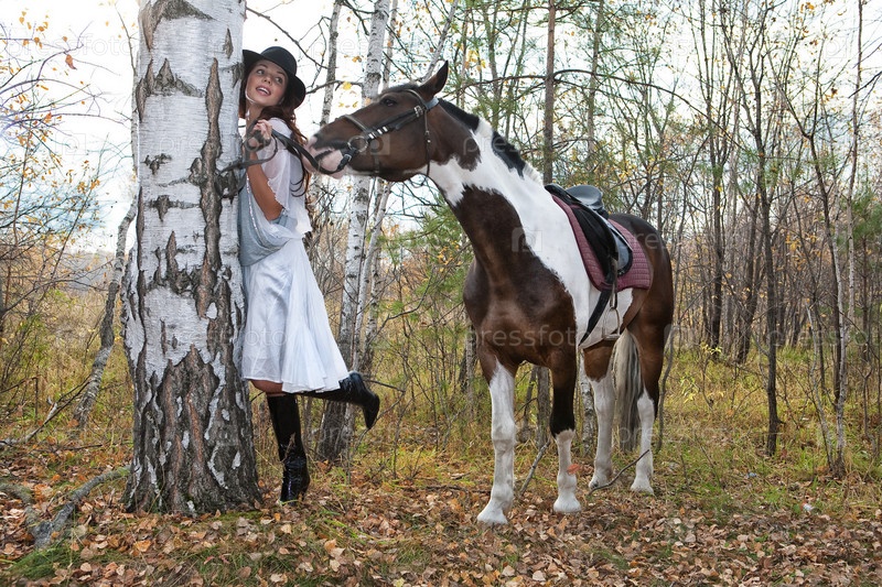 Красивая девушка позирует с лошадью в березовой роще