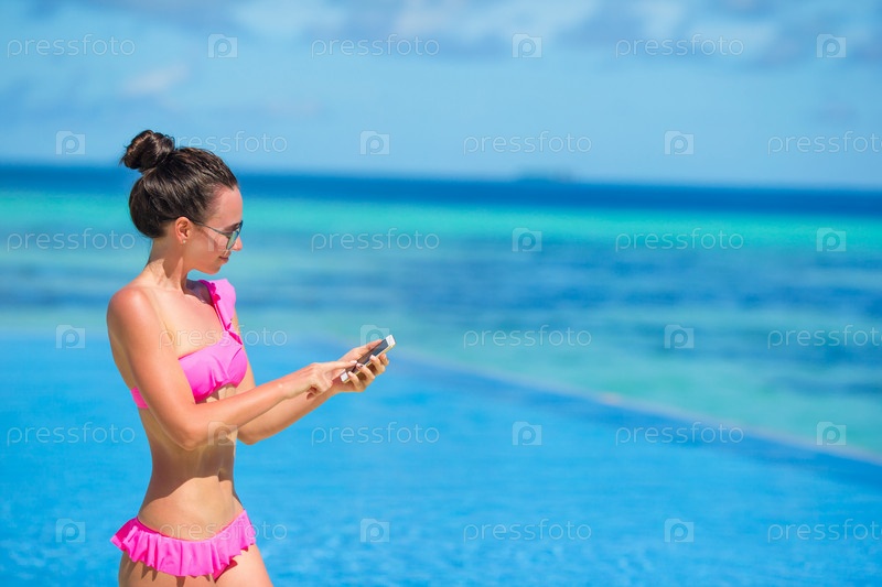 Молодая красивая женщина с телефоном на пляже