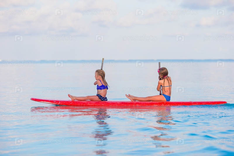Девочки плывут на доске для серфинга
