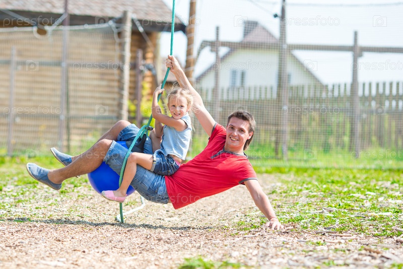 Отец с дочкой качаются на качелях