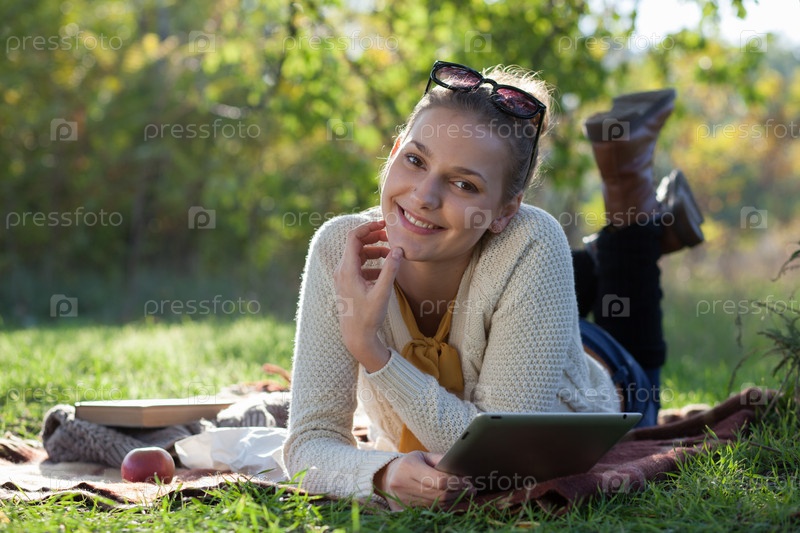 Девушка, лежа с планшетнм ПК под деревом