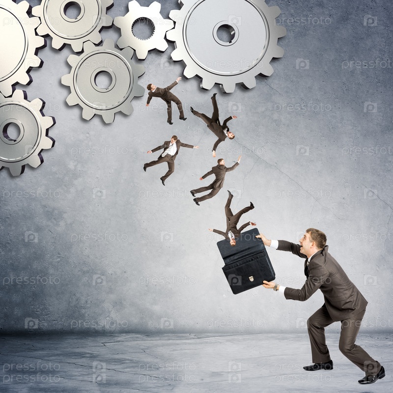 Счастливый бизнесмен ловит деловых людей в чемодан