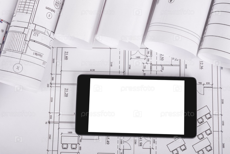 Строительные чертежи и телефон с широким экраном