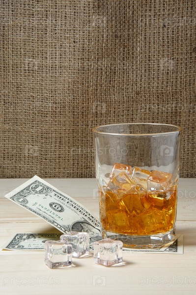 Доллары и стакан виски со льдом