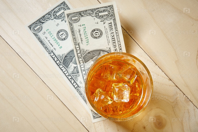 Доллары и стакан виски со льдом