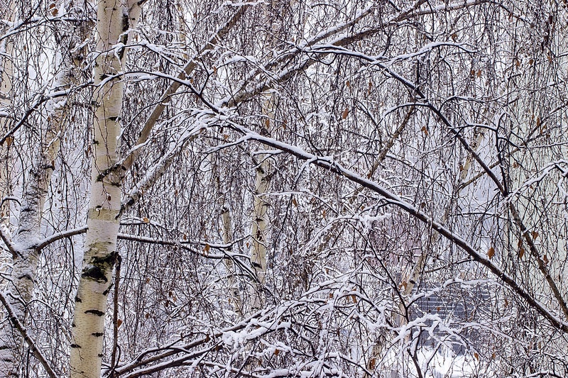 Ветви березы, покрытые снегом