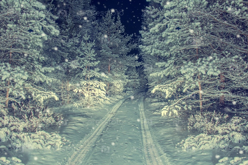 Ночная дорога в снежном лесу