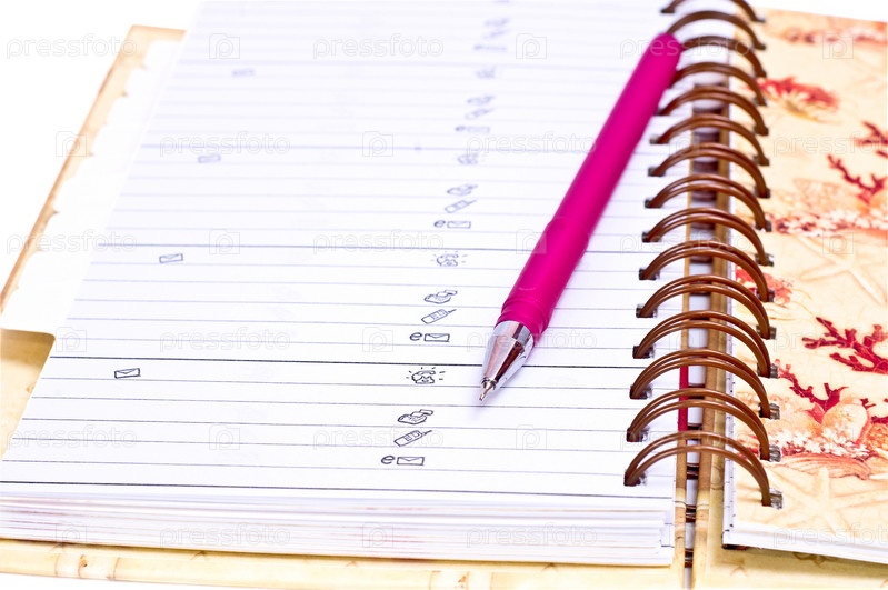 Деловой дневник с розовым ручкой, изолированной на белом