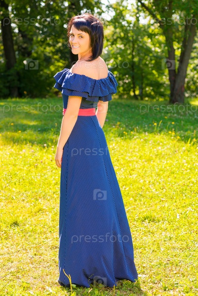 Красивая брюнетка в длинном платье в парке