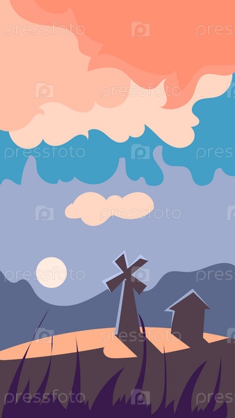Вертикальный пейзаж, мельница на рассвете