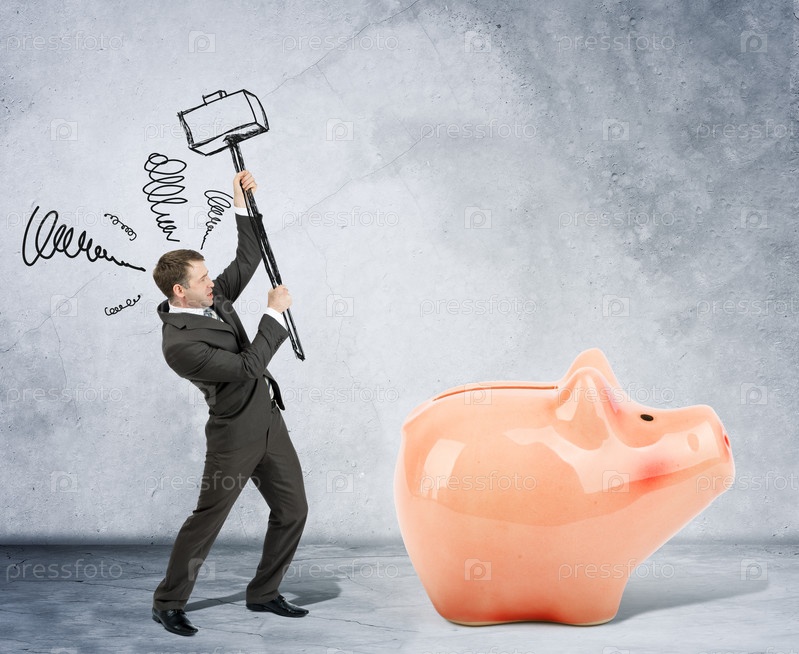 Бизнесмен с молотком и копилка