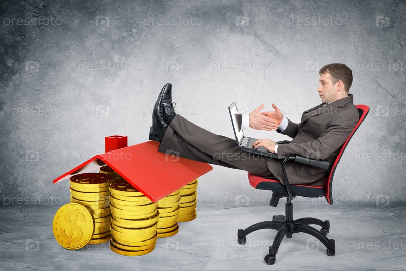 Бизнесмен сидя на деньгах