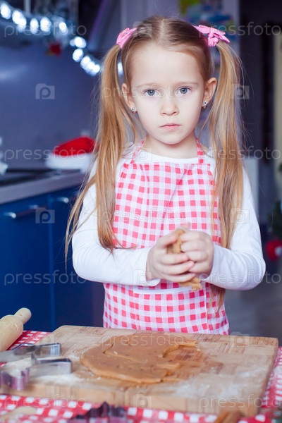 Маленькая милая девочка выпекает пряники на Рождество на домашней кухне