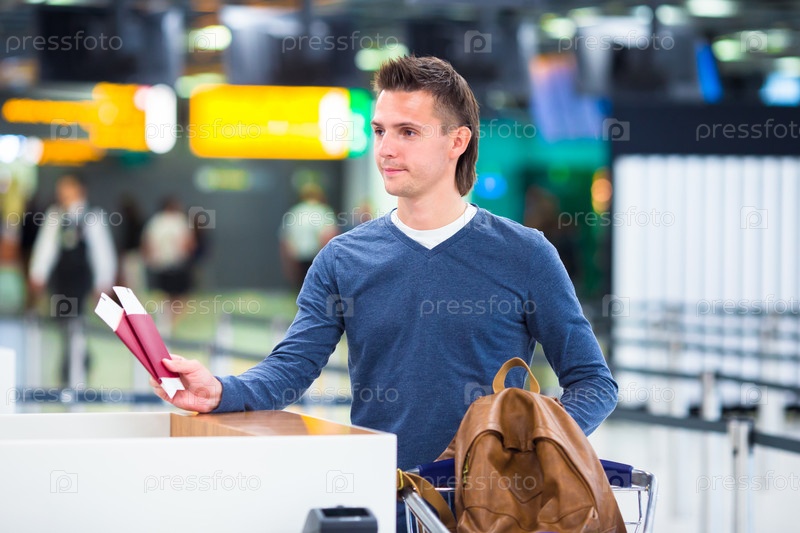 Молодой человек с паспортами на стойке регистрации в аэропорту