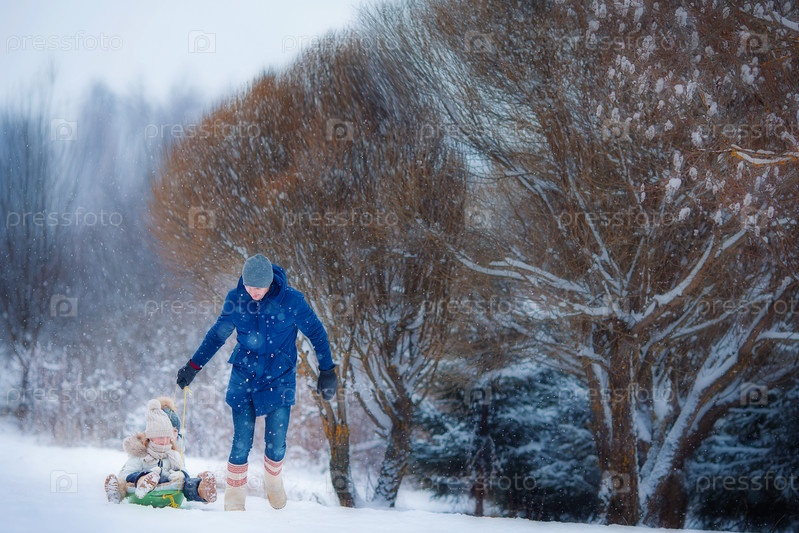 Отец катает дочек на санках
