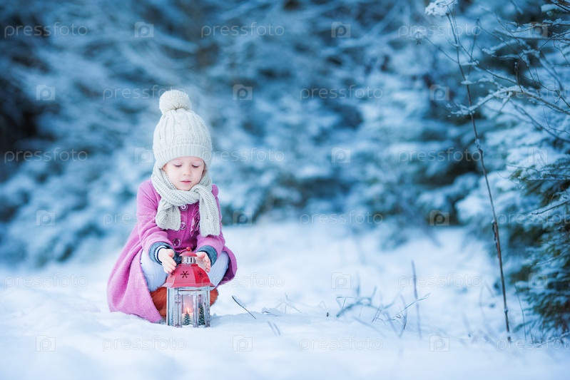 Очаровательная маленькая девочка с фонариком в зимнем лесу