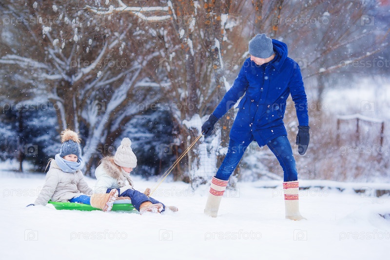 Отец катает дочек на санях