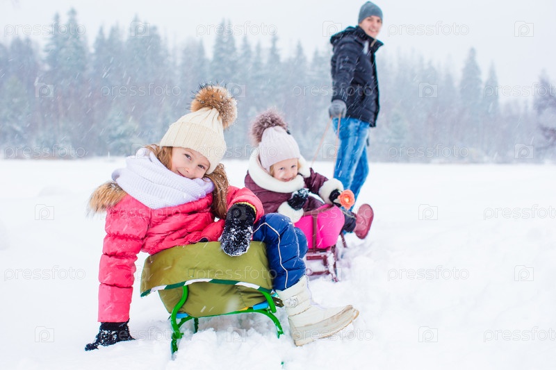 Отец катает дочерей на санках