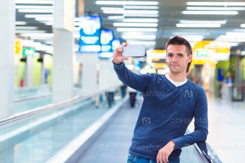 Мужчина делает селфи в аэропорту