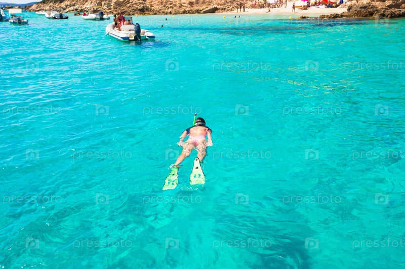 Молодая девушка плавает с трубкой под водой
