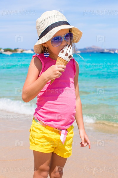 Очаровательная маленькая девочка на пляже с мороженым