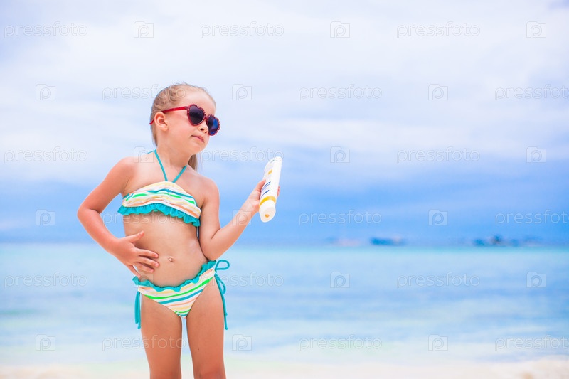 Очаровательная девочка применяет солнцезащитный крем