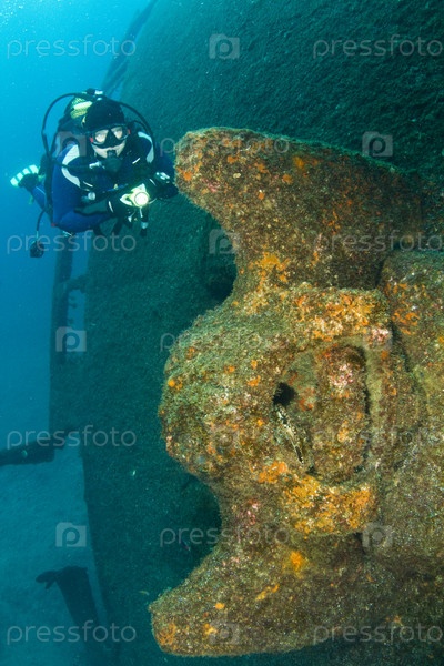Дайвер у якоря затонувшего судна "Дори" на Азорских островах