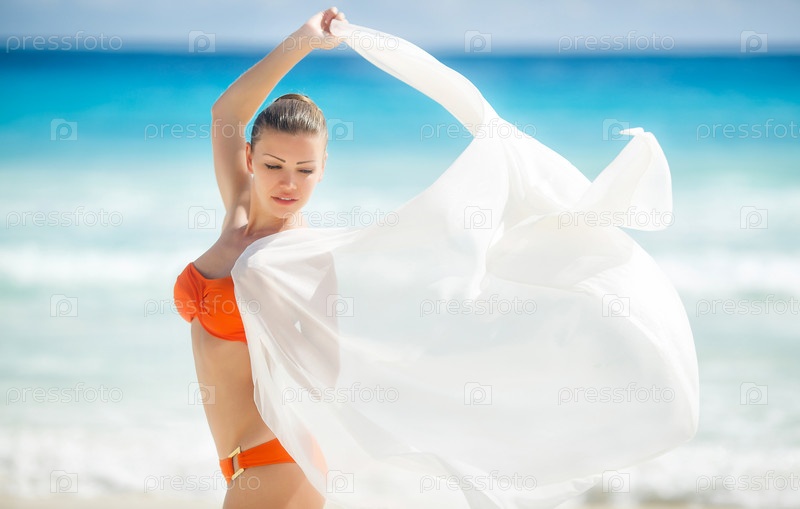 Молодая женщина в купальнике с белым парео