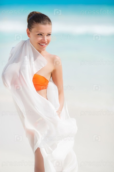 Молодая женщина в купальнике с белым парео
