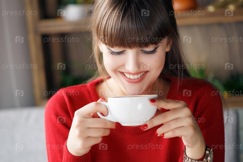 Красивая брюнетка с чашечкой кофе