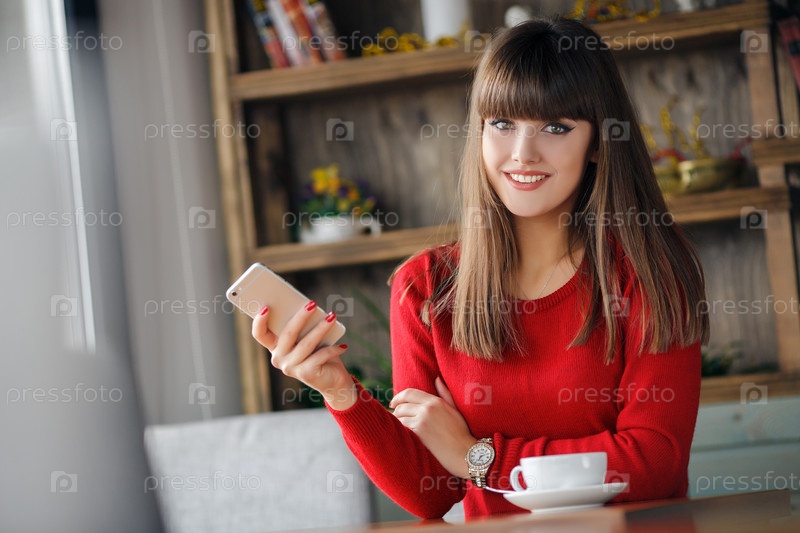 Красивая брюнетка в кафе со смартфоном