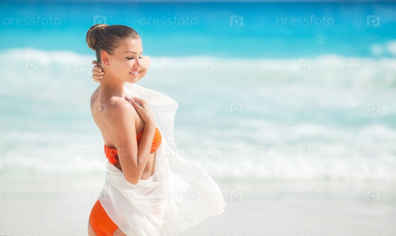 Молодая женщина в купальнике с белым парео