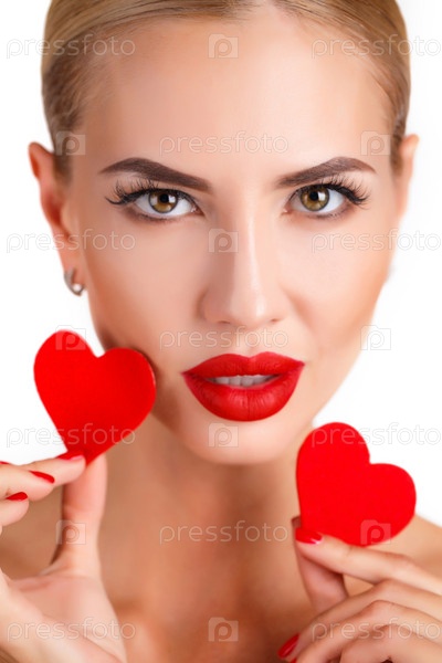 Женщина с красивым макияжем держит красные сердца