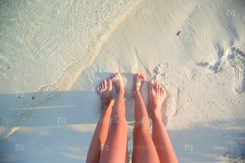 Ноги мамы и ребенка на белом песчаном пляже