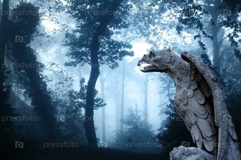Скульптура орла в туманном лесу