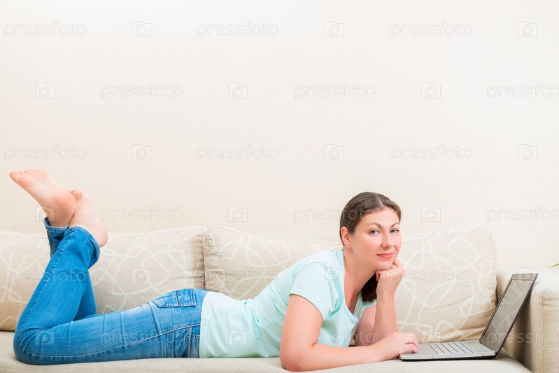 Девушка на диване с ноутбуком