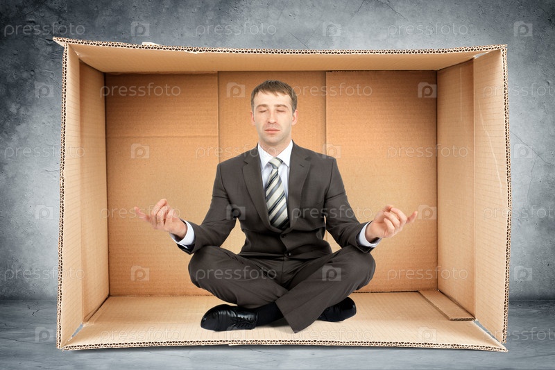 Бизнесмен сидит в коробке