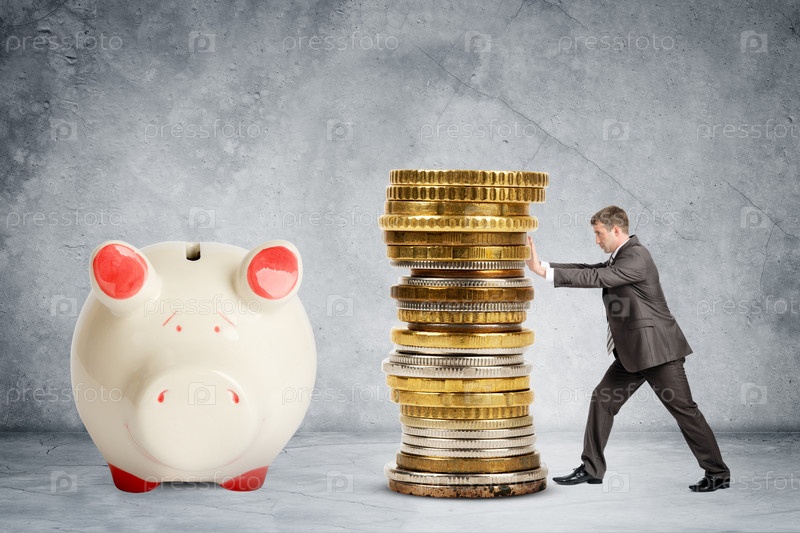 Бизнесмен толкает монеты к копилке