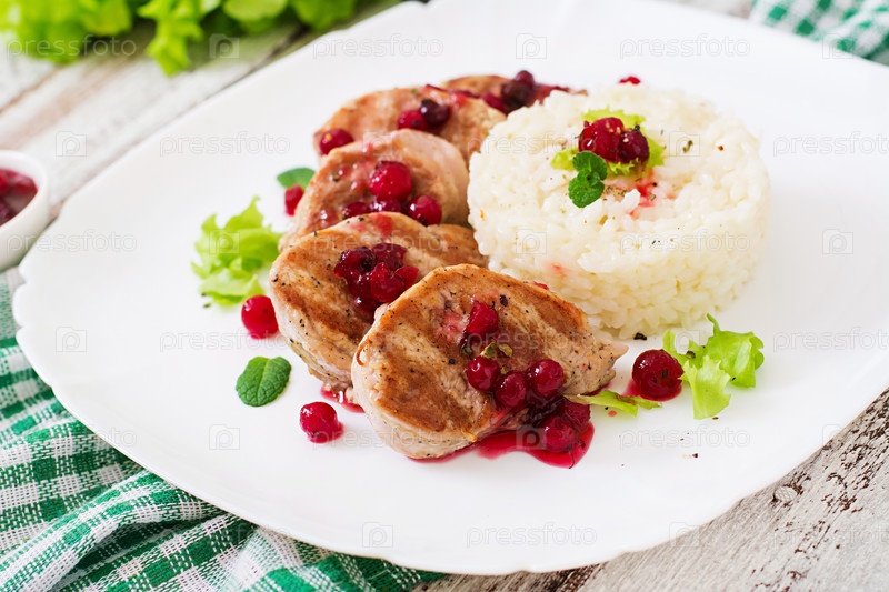 Свиные медальоны под клюквенным соусом с рисом
