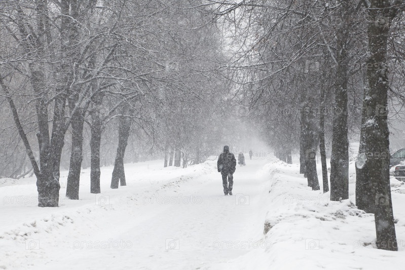 Аллея в городе во время снежной бури