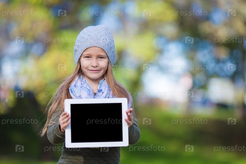 Очаровательная девочка держит планшетный ПК