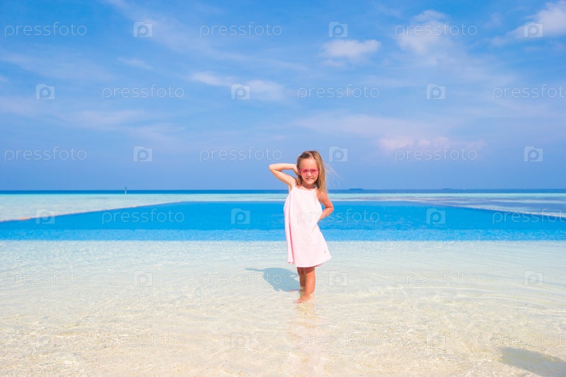 Очаровательная маленькая девочка на пляже во время летних каникул